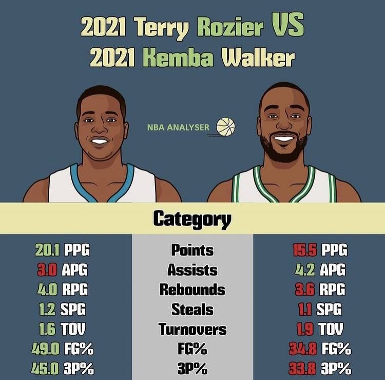 直播吧2月16日讯 凯尔特人球员肯巴-沃克本赛季复出后状态不佳;而黄蜂球员罗齐尔最近手感火热,连续3场砍下30+。有媒体统计了肯巴-沃克和罗齐尔进入2021年以来的数据对比,罗齐尔多项占优。