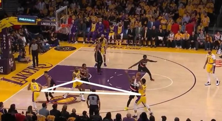 科比几乎整个职业生涯都在打三角进攻,在他去世后的第一场比赛,也就是北京时间2020年2月1号,湖人在主场迎战开拓者,在开场后第一回合,湖人就打了一个三角进攻,如下图所示,由詹姆斯出任三角进攻的低位核心,并发起进攻: