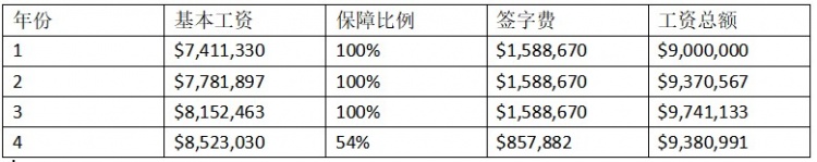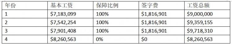 如上图所示,第一个赛季的基本工资是$7183099,该金额的5%是$359155。这是基本工资或总工资(最右边一列)可以每年变化(上涨或下降)的最大数额。然而,在第4年中,总工资减少了1457746美元,就是因为签字费与无保障工资的组合是不相容的。该合同可以通过多种方式来调整(用以保障球员利益),如协调加薪、增加保障部分工资与增加签字费等。