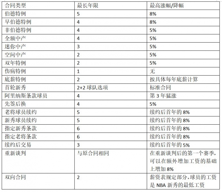总体来说,NBA球员薪水的年限和涨幅与他们签约的合同类型有关,正常情况下,例如一支球队在工资帽以下签约自由球员时,签约的最长年限为4年,最大加薪幅度为5%。但随着签约合同的不同,也有很多其他情况,详见下表: