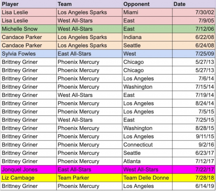 2002年7月30日,洛杉矶火花队的名宿丽萨-莱斯利,成为WNBA历史上首位在比赛中完成扣篮的球员。而我们熟悉的“女飞人”坎黛丝-帕克则是第二位在常规赛中完成扣篮的WNBA球员。时至今日,也只有莱斯利、帕克、格里娜3人在常规赛完成过扣篮,就连身高2米03的全明星中锋伊丽莎白-坎贝奇,也“仅”在全明星赛中完成过一次扣篮表演。