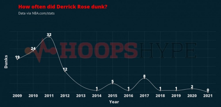 在当选MVP的那个赛季(2010-11赛季),罗斯一共出战81场常规赛,完成32记扣篮,这是他生涯的最高纪录。而那个赛季全明星前锋邓肯的扣篮次数和罗斯相同。从那个赛季之后的十年里,罗斯共出战406场常规赛,他这十年间的扣篮数加起来都没有他当年一个赛季的扣篮数多。从2019年11月1日起至今,罗斯便再也没有在常规赛中扣过篮。罗斯虽然不再扣篮了,但他似乎能通过更多的方式帮助球队赢球。