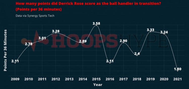 2014-15赛季,罗斯刚从前交叉韧带撕裂的伤病中恢复过来,那个赛季他打满了整个常规赛,数据统计显示他那个赛季进攻时的平均速度达到了每小时4.78英里。而本赛季在尼克斯打球期间,这一数据仅仅为每小时4.44英里。从表面上看,数据下滑不是很大,但数据背后的结果可能分别是空位得分和被防住。衡量一位球员快攻能力最直接的数据就是他在转换进攻中作为持球者得分的能力,从这一角度看他本赛季的快攻得分是罗斯进入联盟以来的最低的一个赛季。罗斯说:“我拉杆的次数也少了很多。”