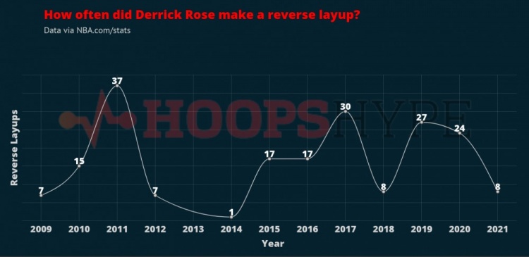 巅峰时期的罗斯上演暴力隔扣的次数不是很多,但他的上篮堪称一绝,防守球员不知道他会以怎样的方式完成拉杆上篮。当选MVP的那个赛季,罗斯共完成过37次反手上篮,2016-17赛季完成30次反手上篮,而本赛季他拉杆上篮的次数不超过10次,常规赛期间更是只有8次。