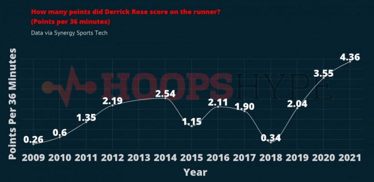 罗斯职业生涯各赛季跑投得分(每36分钟数据)