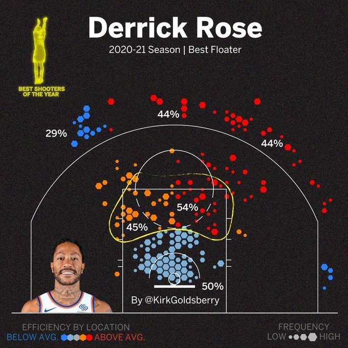 前段时间他在Ins上发表了关于自己从大学时期到现在打法变化的长文,作为2008年选秀大会的状元,罗斯在新秀赛季凭借场均16.8分的表现当选年度最佳新秀,但他的效率不是很高,根据数据统计,罗斯新秀赛季平均每回合得到0.89分,这一数据只超过了当赛季44%的球员。即使在他当选MVP的赛季,罗斯平均每回合也只得到0.96分,这一数据仅超过了当时67%的球员,这和当时联盟其他顶级球星相比还有一定距离。