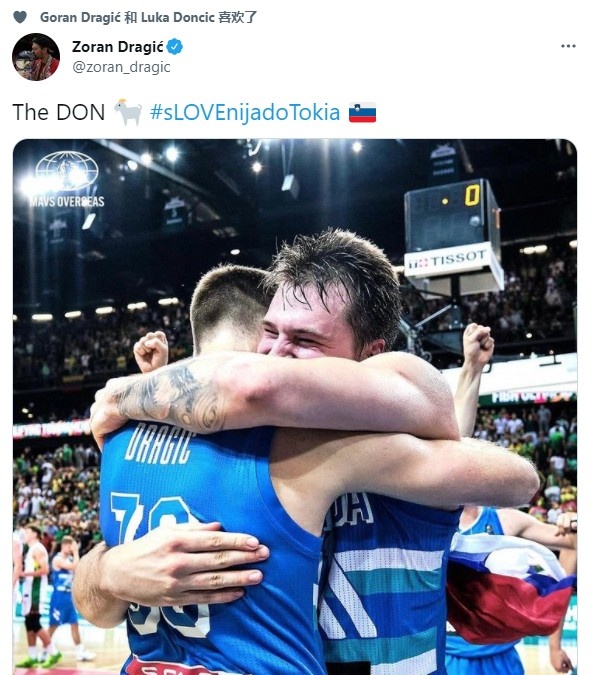 本场比赛赛后,热火球员戈兰-德拉季奇的弟弟佐兰-德拉季奇发推晒出了和东契奇的拥抱合照并写道:伟大!历史最佳!#斯洛文尼亚去东京啦!
