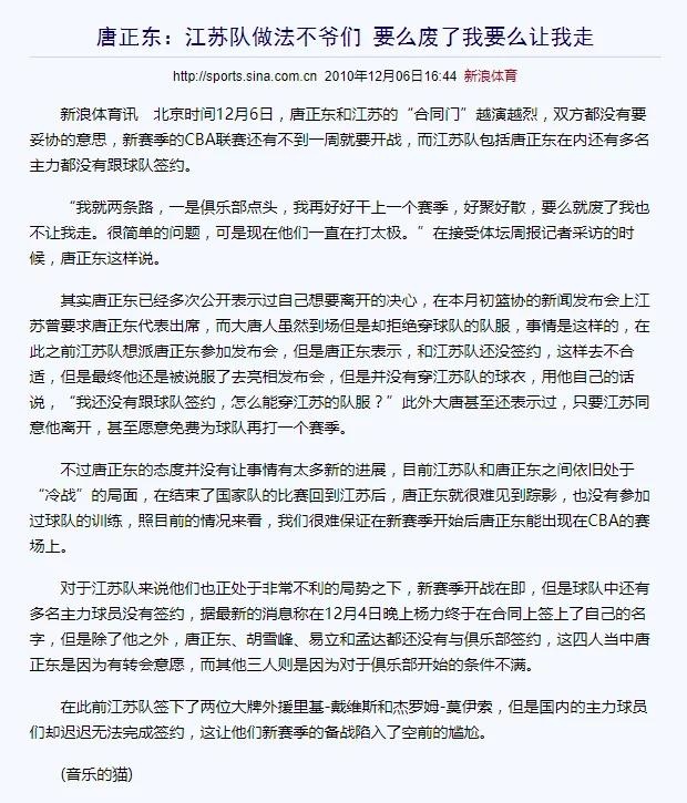 在CBA,当家球星和主队闹别扭,以至整赛季报销为代价的类似案例并不鲜见,而球员和球队作为纠纷双方也是各有胜负。早在十年前的CBA,当时唐正东与江苏队之间就曾展开过一场旷日持久的争斗。