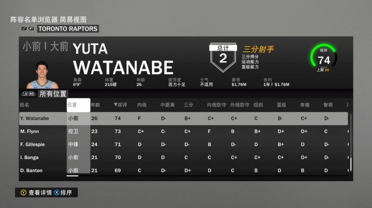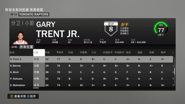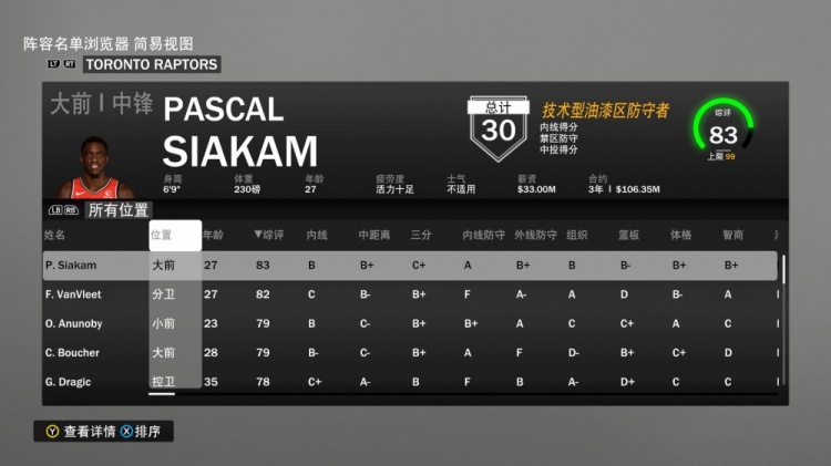 猛龙队中,仅西亚卡姆与范弗里特能力值超80。