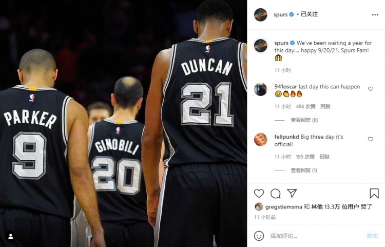 GDP组合于2002年正式组建,随后并肩作战14年,期间共为马刺夺得4个总冠军。马刺官方今日在晒照的同时,也激动地发文:“这一天我们等了一年了……马刺大家庭9/20/21快乐!”