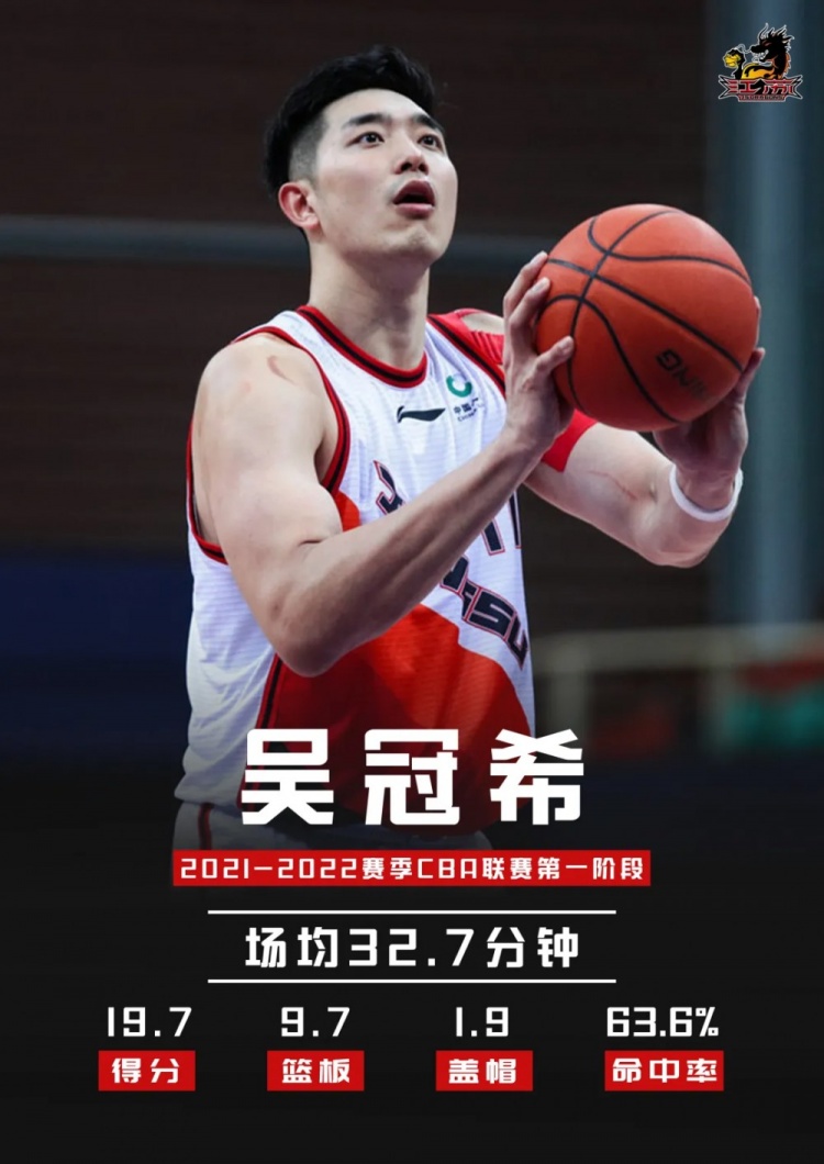 吴冠希在第一阶段比赛中四次砍下20+10,在国内球员中,场均得分排名第六,场均篮板排名第五,是球队的“定海神针”。在经过一夏天的康复和训练,冠希强势回归,不仅能够凭借个人能力在低位背身单打,还能与后卫线完成传切配合,投篮命中率高达63.6%,位居联盟第六。在防守端,场均1.9盖帽排名联盟第四,特别是在与青岛队的二次对决中的关键一帽,帮助球队稳住了胜局,关键时刻显担当!