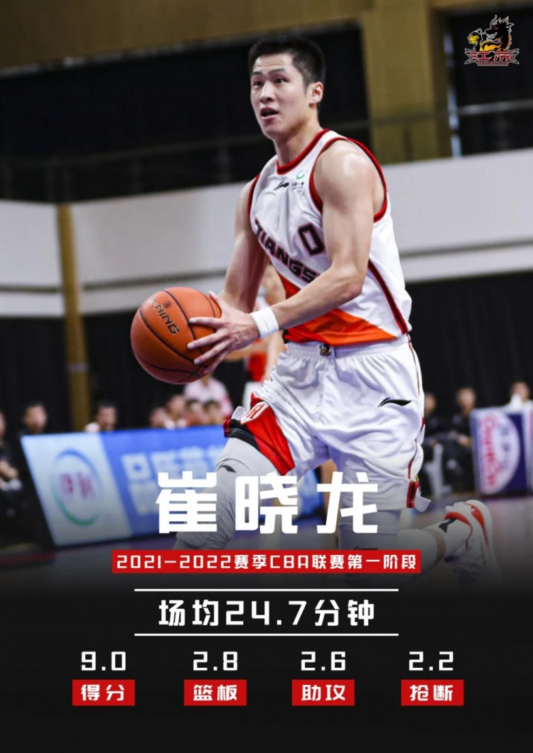 崔晓龙初登CBA舞台,在首场季前赛中拿到20分9篮板3助攻3抢断的亮眼数据,虽在常规赛中得分数据略有下降,但他从防守开始做起,拼抢相当积极,场均2.2次抢断在国内球员抢断榜中排名第五。接下来,希望晓龙能够尽快适应CBA的比赛强度,在攻防两端都能有出色的表现,成为球队后卫线的一大“利器”!