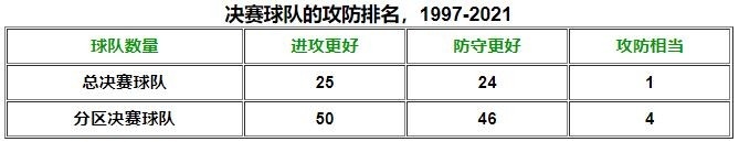 总决赛球队的平均进攻排名为6.8,平均防守排名为7.0。所有进入分区决赛的球队表现出相特征:平均进攻排名为7.1,平均防守排名为7.5。总的来说,对于走到季后赛决赛阶段的球队来说,进攻能力和防守能力同样重要——如果不是更重要的话。