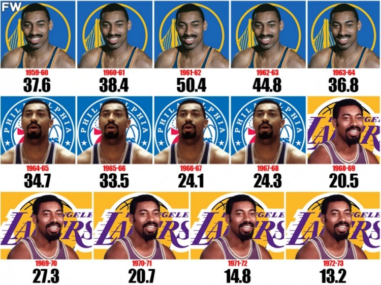 直播吧2月6日讯 近日,美国媒体Fadeaway World盘点了张伯伦职业生涯各个赛季的场均得分。