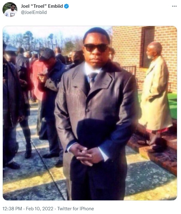 在交易被报道后,恩比德更新了自己的推特,内容仅为一张黑人西装墨镜男的图片。