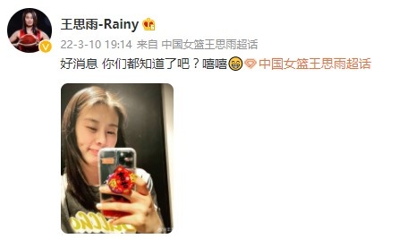 王思雨写道:“好消息 你们都知道了吧?嘻嘻。”