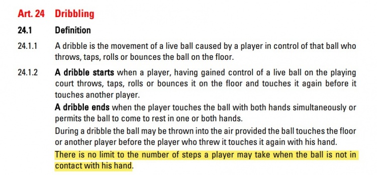 还是看规则,FIBA规则最新版关于运球的定义中有这么一句:“球员运球时,当球不在他的手中时,没有步数的限制(下图黄线句子)。”