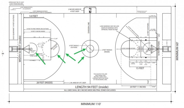 NBA官方在2018-19赛季开始执行现行的Clear path犯规规则,从记者的报道、到NBA官方的公告、再到NBA最后出台的手册,NBA都是使用“后场的弧的顶点”这个模糊的描述来定义这个位置,表哥根据自己58年的看球经验发现,NBA球场的后场,有五条弧(此处略去一句脏话),NBA说的具体是哪条,表哥表示非常(再略去一句脏话)的困惑。