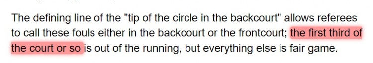 最后,我们再来聊一下后场的弧的顶点(the ball is ahead the tip of the circle in the backcourt)在哪里这个问题。