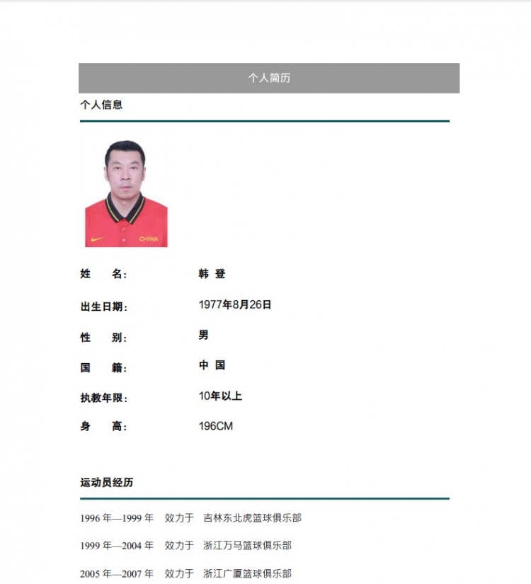 经竞聘选拔,中国篮球协会拟聘韩登全职担任国家男篮二队主教练,自即日起进行公示。