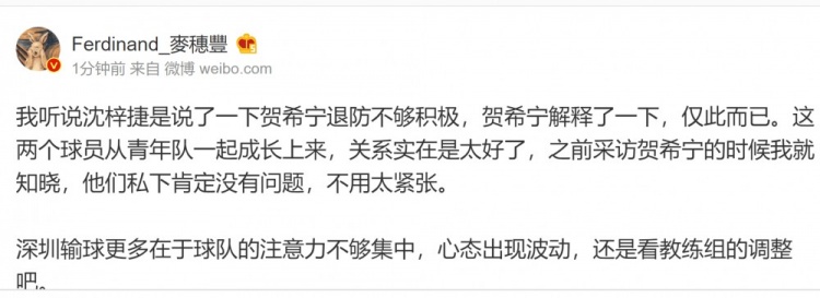 赛后,据媒体人麦穗丰报道,此次争吵是沈梓捷在说贺希宁回防不够积极,然后贺希宁解释了一下,仅此而已。