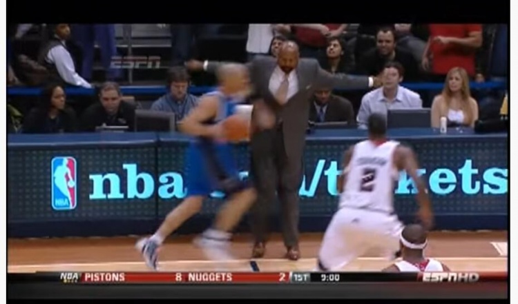 然后是成功造T的名场面,基德的成名战之一。2011年,老鹰和独行侠的一场常规赛,最后时刻基德运球推进。看到当时老鹰的主教练伍德森站在球场之内,基德直接带球撞了上去。