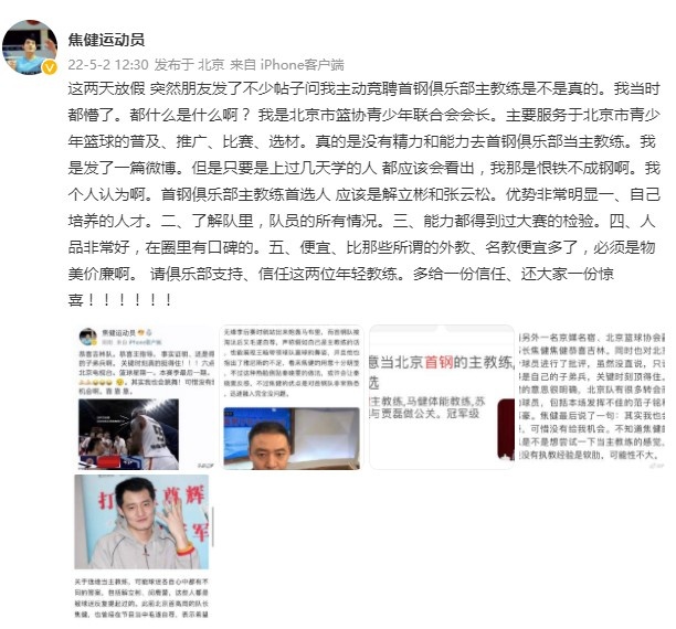 直播吧5月2日讯 前国手、北京男篮名宿焦健发博回应了有关他主动竞聘北京首钢俱乐部主教练的传闻。