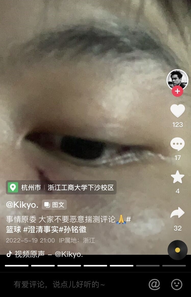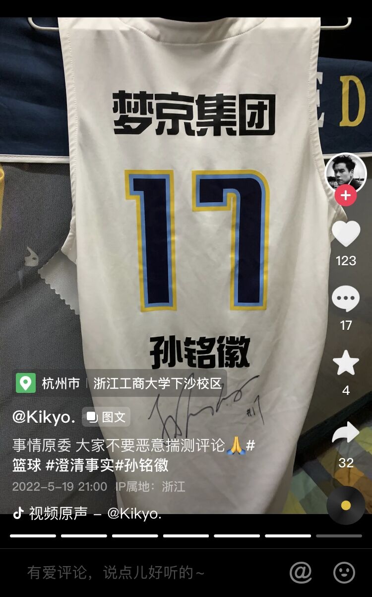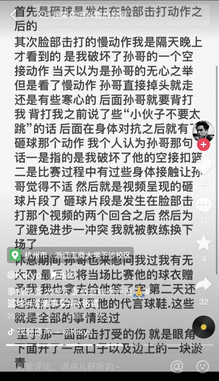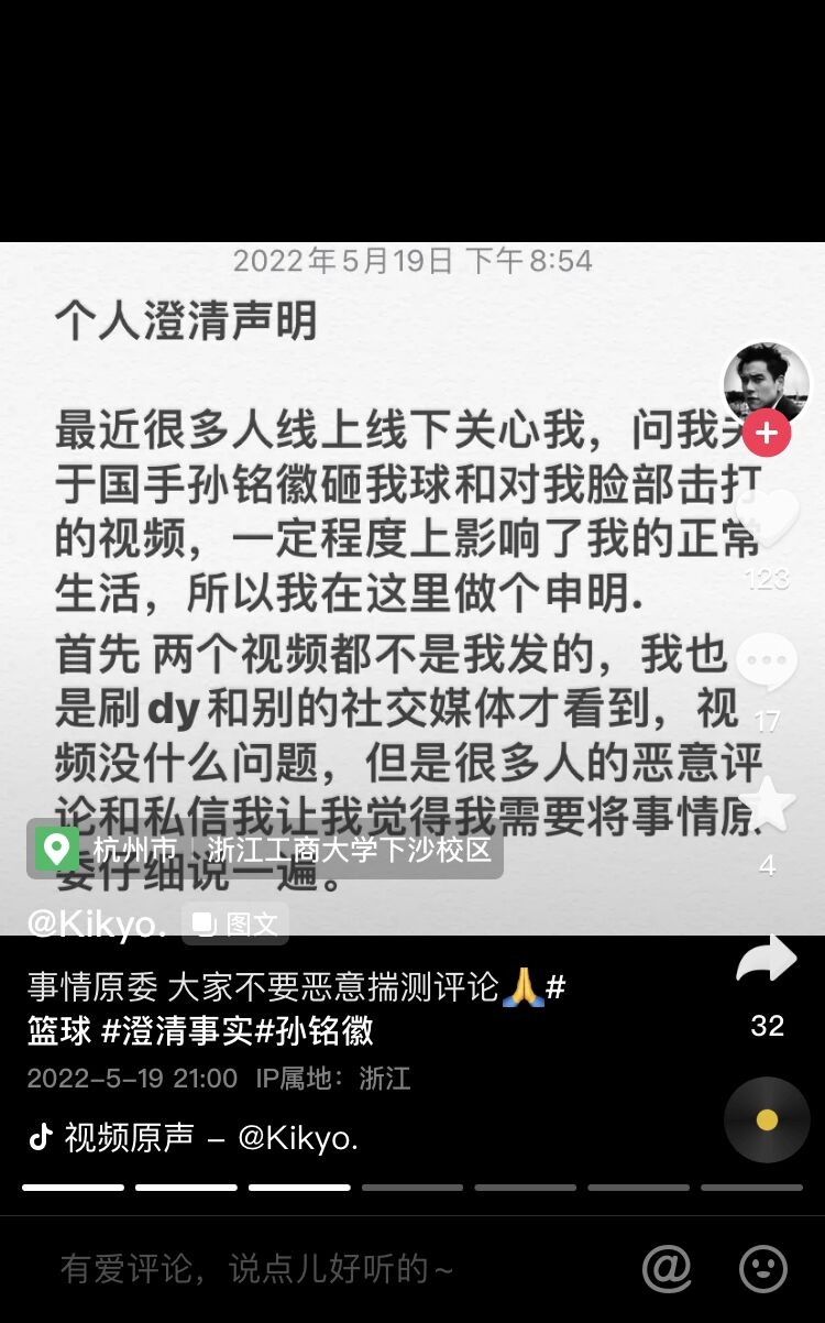 直播吧5月20日讯 据此前报道,孙铭徽此前在浙江某大学打野球时被拍到用球砸防守其的学生的视频。近日,被砸的学生本人在个人社交媒体上对此事做出了回应,详情如下: