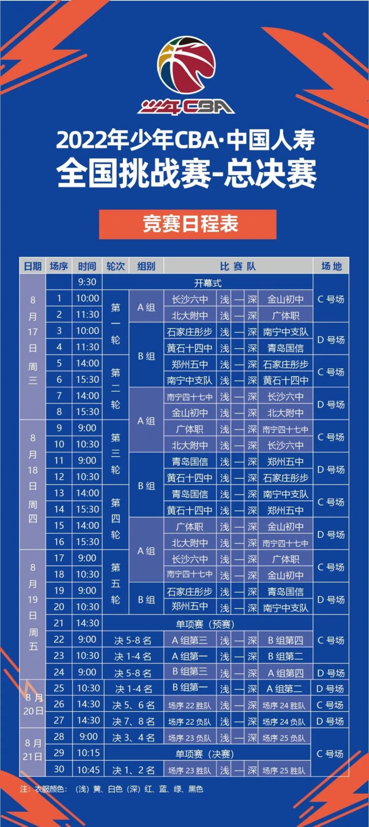 直播吧8月17日讯 CBA联赛官方公布了2022年少年CBA-中国人寿全国挑战赛总决赛赛程。