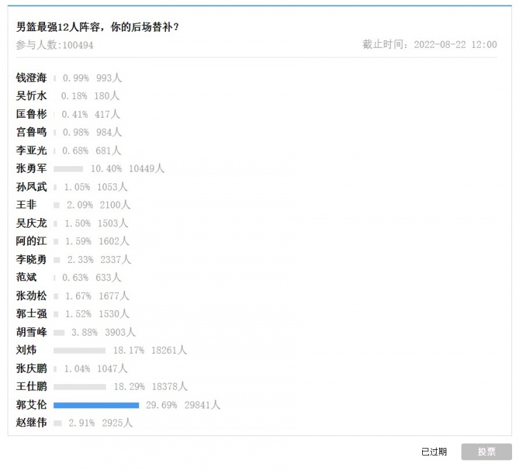 今天将进行第三期评选,即前场首发(最多可选3人),提名包括一些为中国篮球做出过巨大贡献的先辈,以及在国家队有过优秀表现的球员。