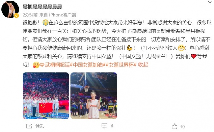 武桐桐更博写道:“很抱歉!在这么喜悦的氛围中没能给大家带来好消息!非常感谢大家的关心,很多球迷朋友们都在一直关注和关心我的伤势,今天拍了核磁疑似前叉韧带断裂和半月板损伤。但请大家放心我们的领导和团队已经在准备接下来的一切方案和安排了,所以请不要担心我会健健康康回来的,还是会一样的强壮💪!(打不死的小铁人)真心感谢大家的鼓励和关心,请继续支持中国女篮!(中国女篮!无畏金兰!)爱你们❤️等我哦!”