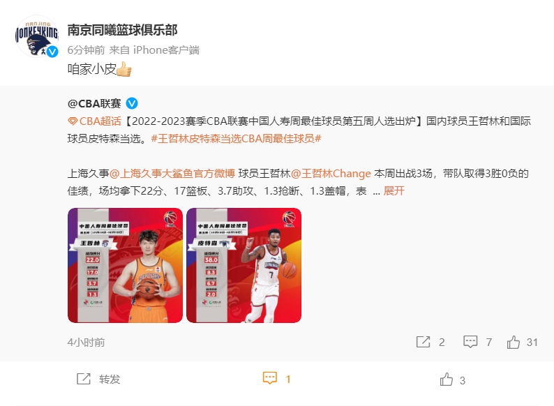 南京同曦官方微博转发了CBA联赛的报道,并写道:“咱家小皮👍”