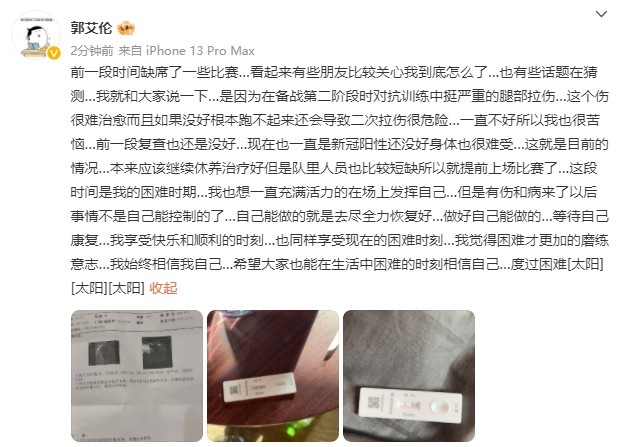 郭艾伦写道:“前一段时间缺席了一些比赛,看起来有些朋友比较关心我到底怎么了,也有些话题在猜测,我就和大家说一下,是因为在备战第二阶段时对抗训练中挺严重的腿部拉伤,这个伤很难治愈而且如果没好根本跑不起来还会导致二次拉伤很危险。一直不好所以我也很苦恼,前一段复查也还是没好。