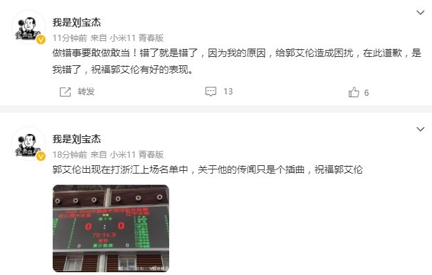 随后,刘宝杰又写道:“做错事要敢做敢当!错了就是错了,因为我的原因,给郭艾伦造成困扰,在此道歉,是我错了,祝福郭艾伦有好的表现。”
