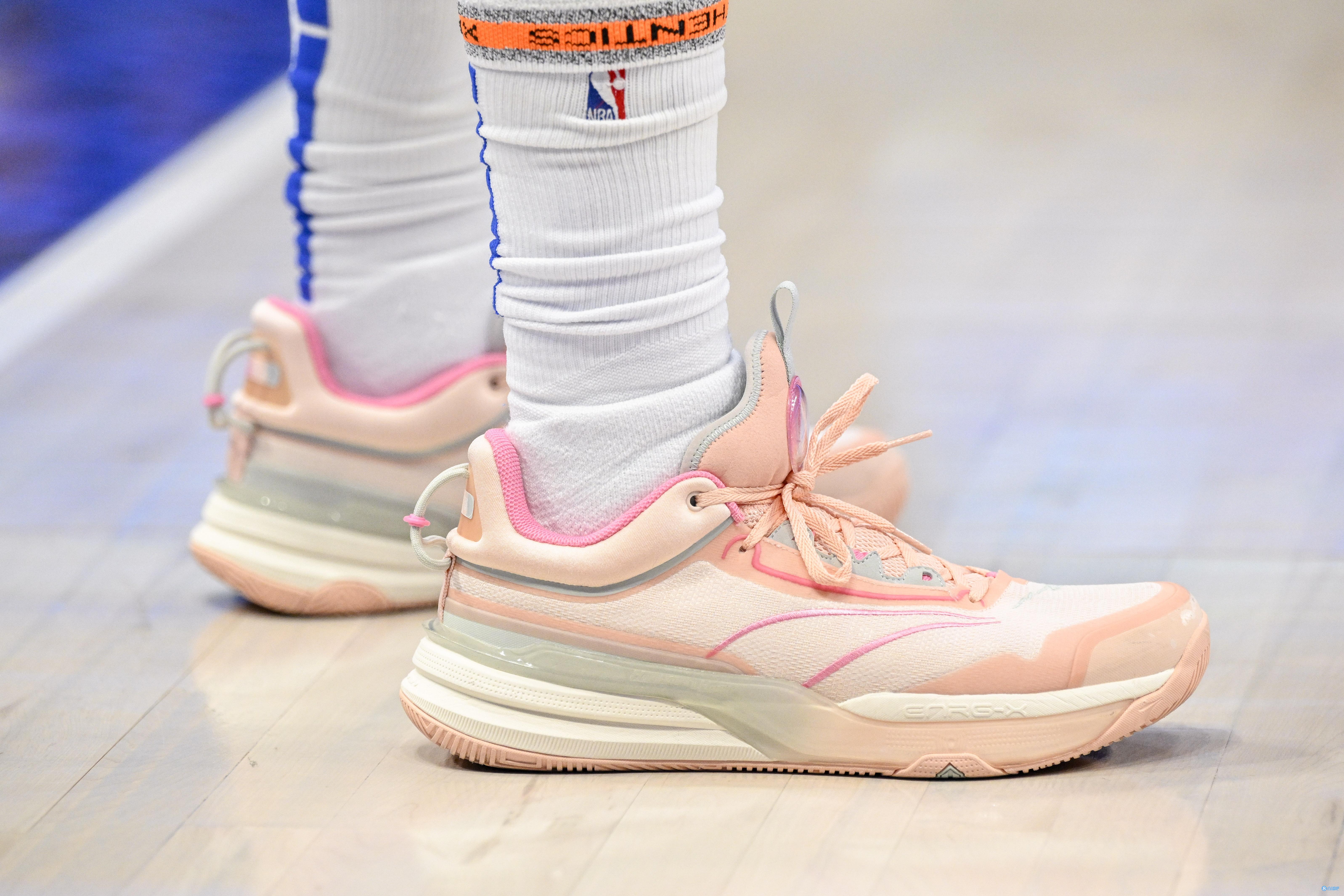 此役,独行侠后卫丁威迪上脚个人初代签名鞋——361度DVD1代“甜蜜蜜”配色战靴。