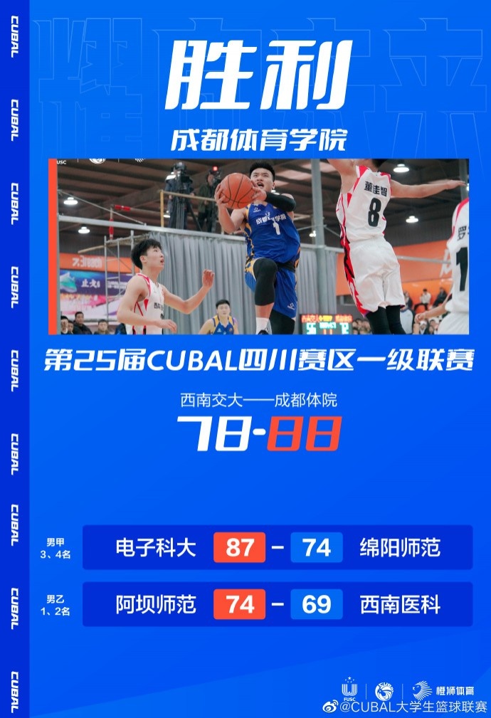 第25届CUBAL大学生篮球联赛,成都体院88-78击败西南交大,时隔两年再次获得四川赛区冠军。