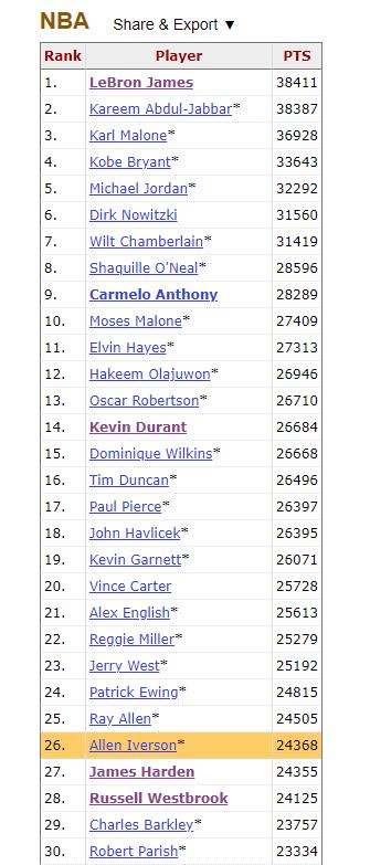这样,哈登生涯得分超越了艾弗森(24368),升至历史第26位,下一位他需要追逐的是雷-阿伦(24505)!