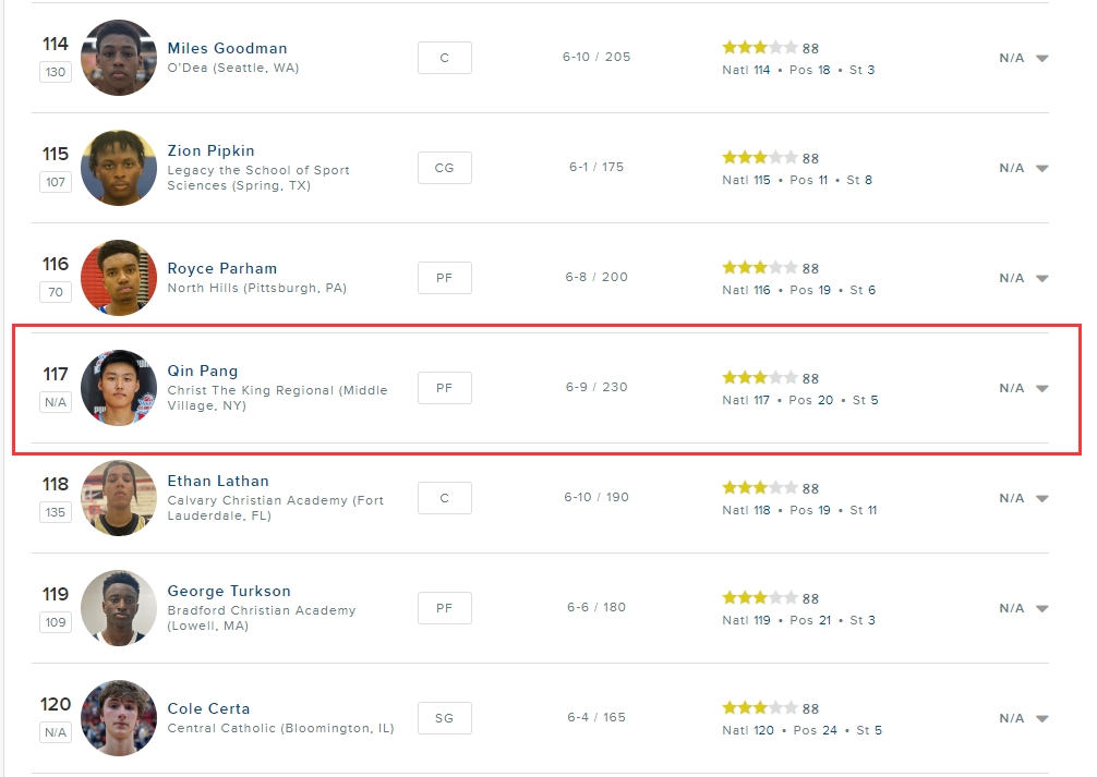 相关新闻:中国小将庞清方首登2024届全美高中生榜单 三星评分87 全美大前29