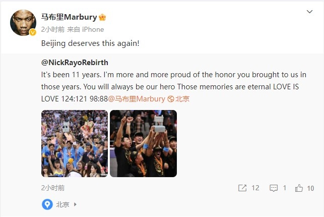 北京男篮功勋球员、现北控主教练马布里在个人微博上写道:“北京值得再次拥有这份荣耀!”