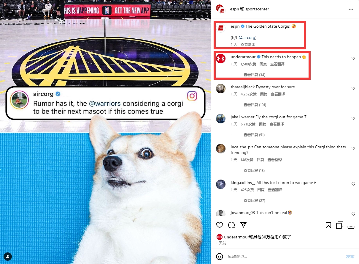 由于湖勇系列赛前五场输赢的进程,与美国预测网红柯基犬Air Corgi此前预测的完全一致,美媒ESPN昨日也转发了Air Corgi主人打趣的言论——有传言说,如果这一切成真(勇士翻盘),那勇士将考虑把柯基做为他们下一个吉祥物。