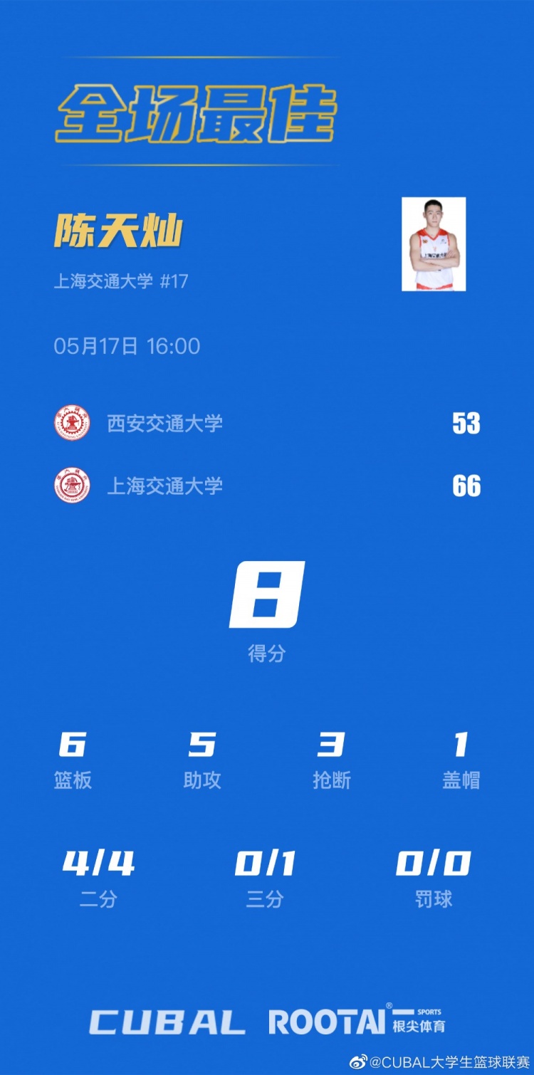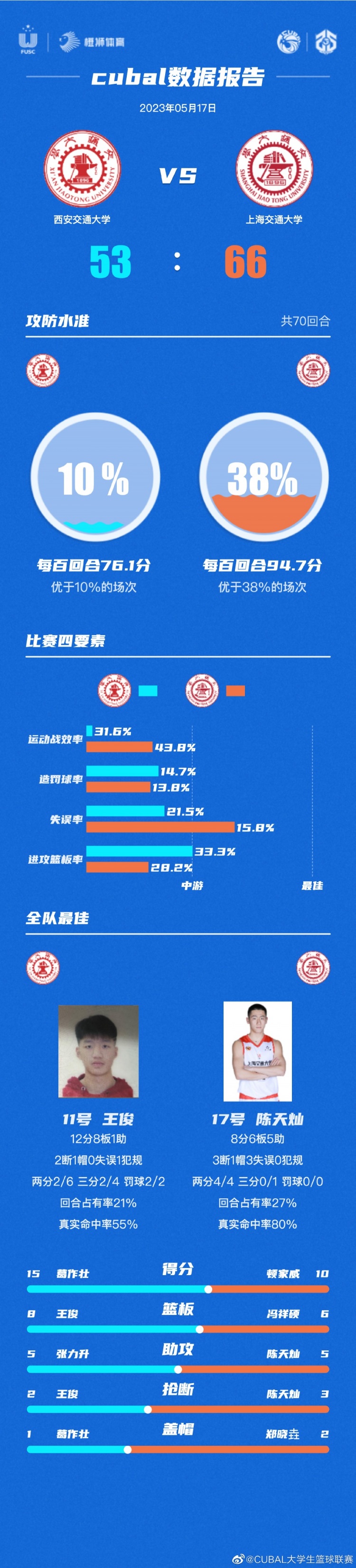 末节,上海交大始终保持10分以上的分差,高效的篮板与抢断让西安交大难以追分,最终全场比赛结束,比分53-66,上海交大胜。