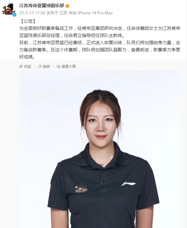 在原总经理史琳杰和原主帅李楠被官宣禁赛的一个月后,江苏肯帝亚正式宣布任命原俱乐部美女副总经理徐嘉妮升任总经理,原球队助教易立出任主教练。恭喜这两位篮二代。
