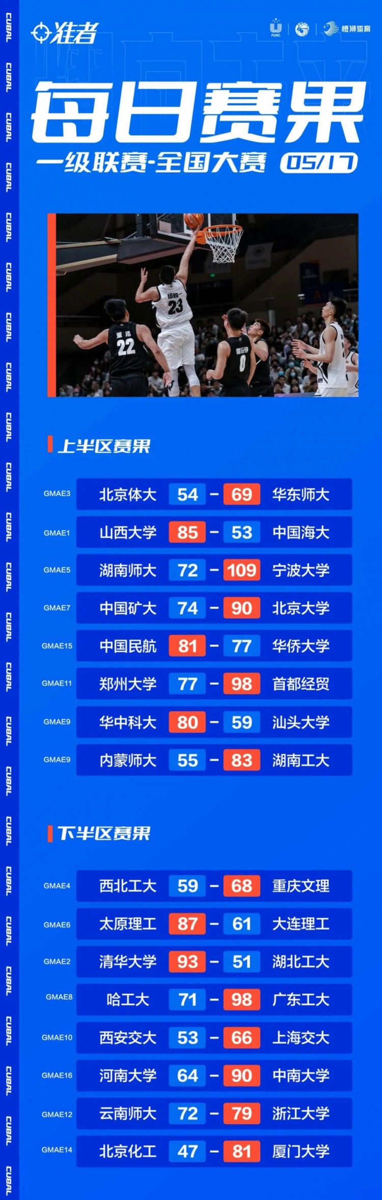 5月17日,第25届中国大学生篮球联赛男篮全国32强赛在华中科技大学正式揭幕!上半区中国民航战胜东南王华侨大学,北京大学战胜中国矿大,取得首胜;另外华东师大、山西大学、宁波大学、首经贸、华中科大、湖南工大分别取胜。下半区,交大德比,上海交大战胜西安交大,重庆文理、太原理工、清华大学、广东工大、中南大学、浙江大学、厦门大学分别战胜对手。明日进行第二轮比拼,多场焦点战!文末附赛程。