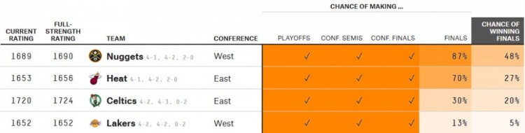 赛后,据大数据机构FiveThirtyEight模型预测,湖人晋级总决赛的概率为13%,掘金高达87%。