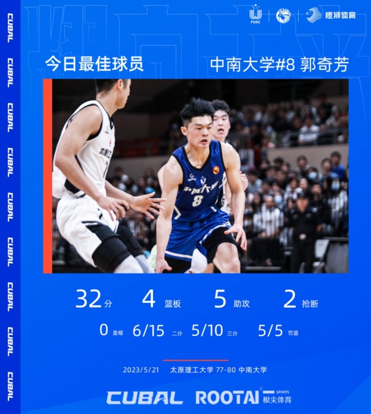 数据方面,中南大学郭奇芳32分4篮板5助攻2抢断、付永康24分5篮板3助攻、赵中兴12分9篮板4助攻;太原理工杜智博24分4篮板、曹芷豪17分6篮板、张凯飞10分7篮板5助攻。