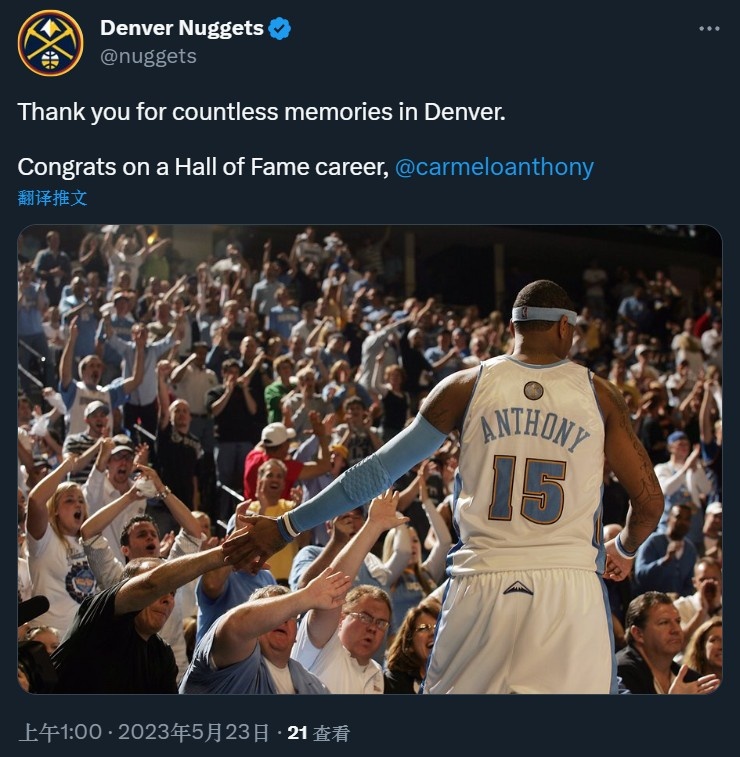随后,掘金官方发推致谢写道:“谢谢你在丹佛留下的无数回忆。祝你进入名人堂@安东尼”