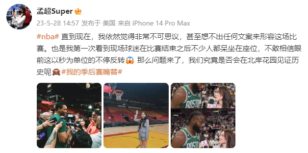 赛后,前方记者孟超发文写道:“直到现在,我依然觉得非常不可思议,甚至想不出任何文案来形容这场比赛。也是我第一次看到现场球迷在比赛结束之后不少人都呆坐在座位,不敢相信眼前这以秒为单位的不停反转😱 那么问题来了,我们究竟是否会在北岸花园见证历史呢。”