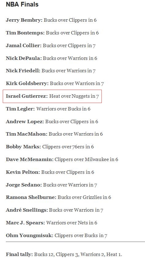 在本赛季开始之前,ESPN邀请18位记者/媒体人预测总冠军,其中有一位名为Israel Gutierrez的记者预测热火和掘金会师总决赛,他预测热火抢七战胜掘金夺得总冠军。
