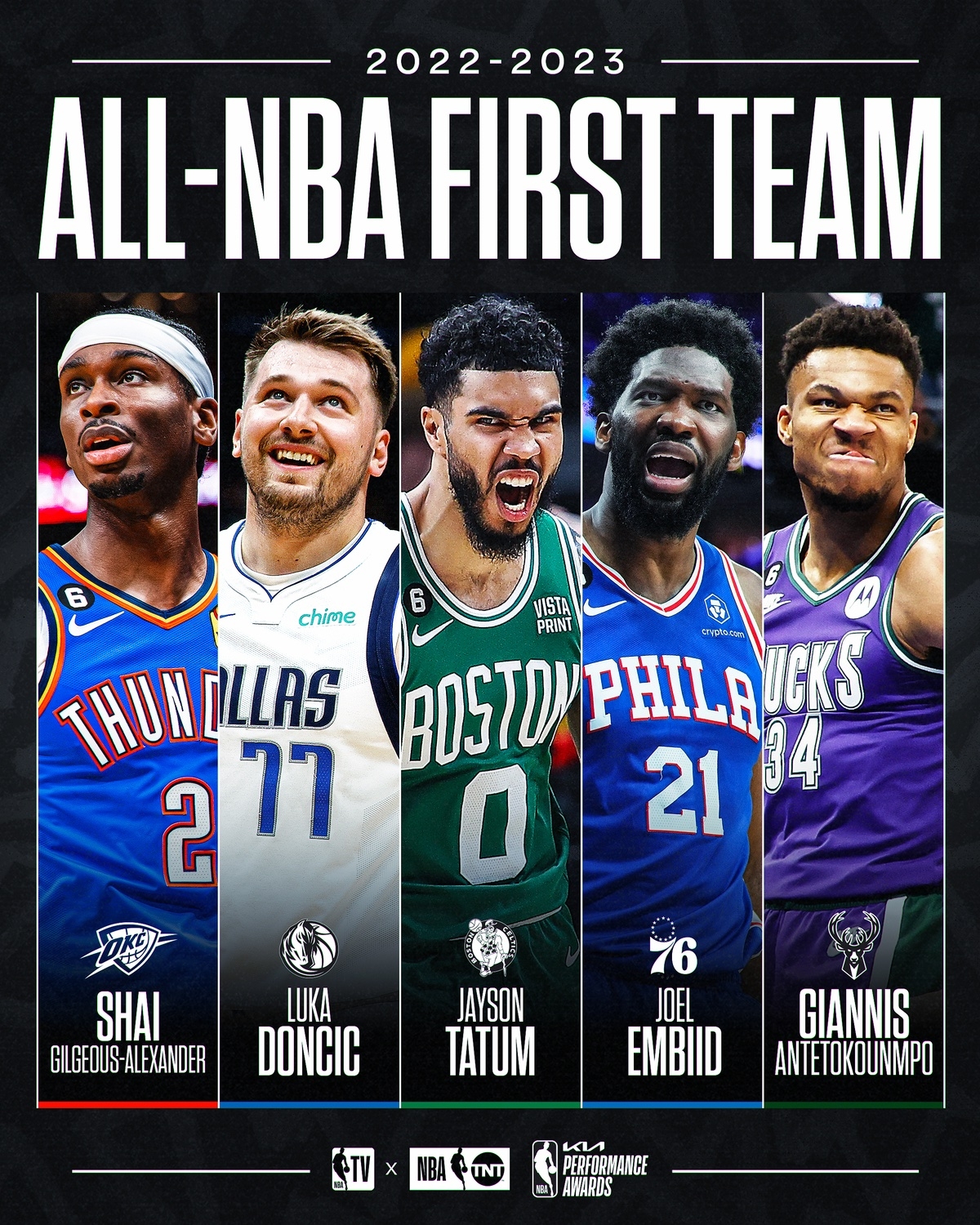 随着塔图姆的出局,本赛季最佳阵容一阵的五位球员已经全部结束了本赛季的征程,他们分别是:字母哥(止步首轮)、恩比德(止步次轮)、塔图姆(止步东决)、亚历山大(无缘季后赛)、东契奇(无缘季后赛)。