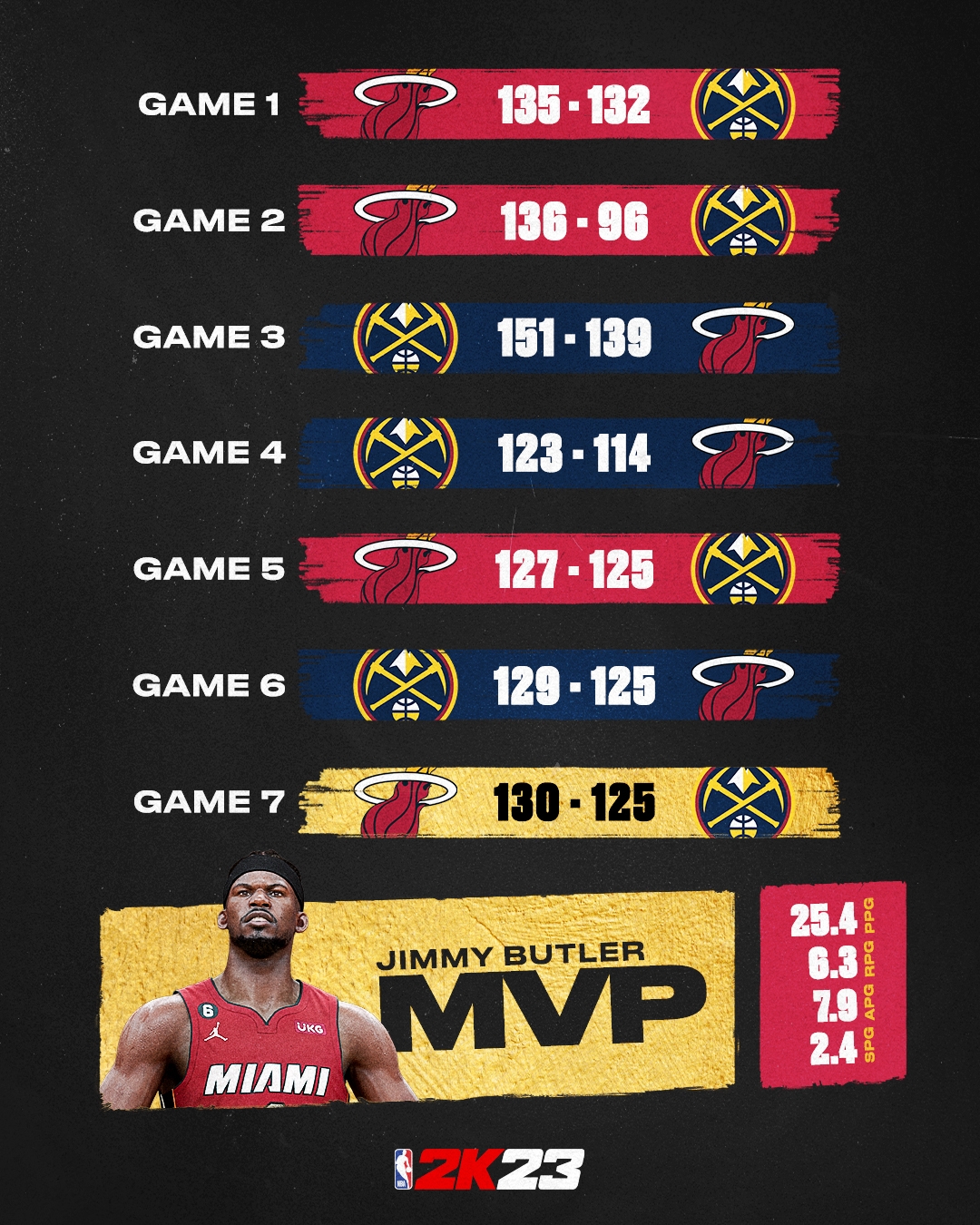 今日,知名篮球游戏NBA2K官方,用NBA2K23对总决赛进行了模拟,最终热火4-3击败掘金夺冠,巴特勒场均25+6+8当选总决赛MVP。